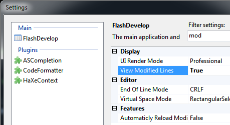 néha jól jön ha látjuk messziről mely sorokat módosítottuk. ehhez a program settings filterében keressünk meg a modified lines kapcsolót és állítsuk true-ra :