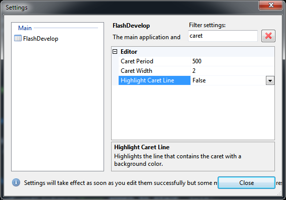 a tools > program settings alatt kijelölve a flash developot, a filterbe írjuk be hogy caret :